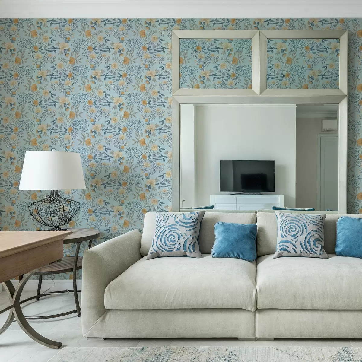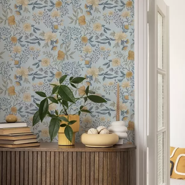 Tapetes Dzeltenas un zilas puķes ar lapām uz debeszilā fona Nr. a00934