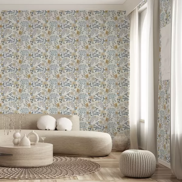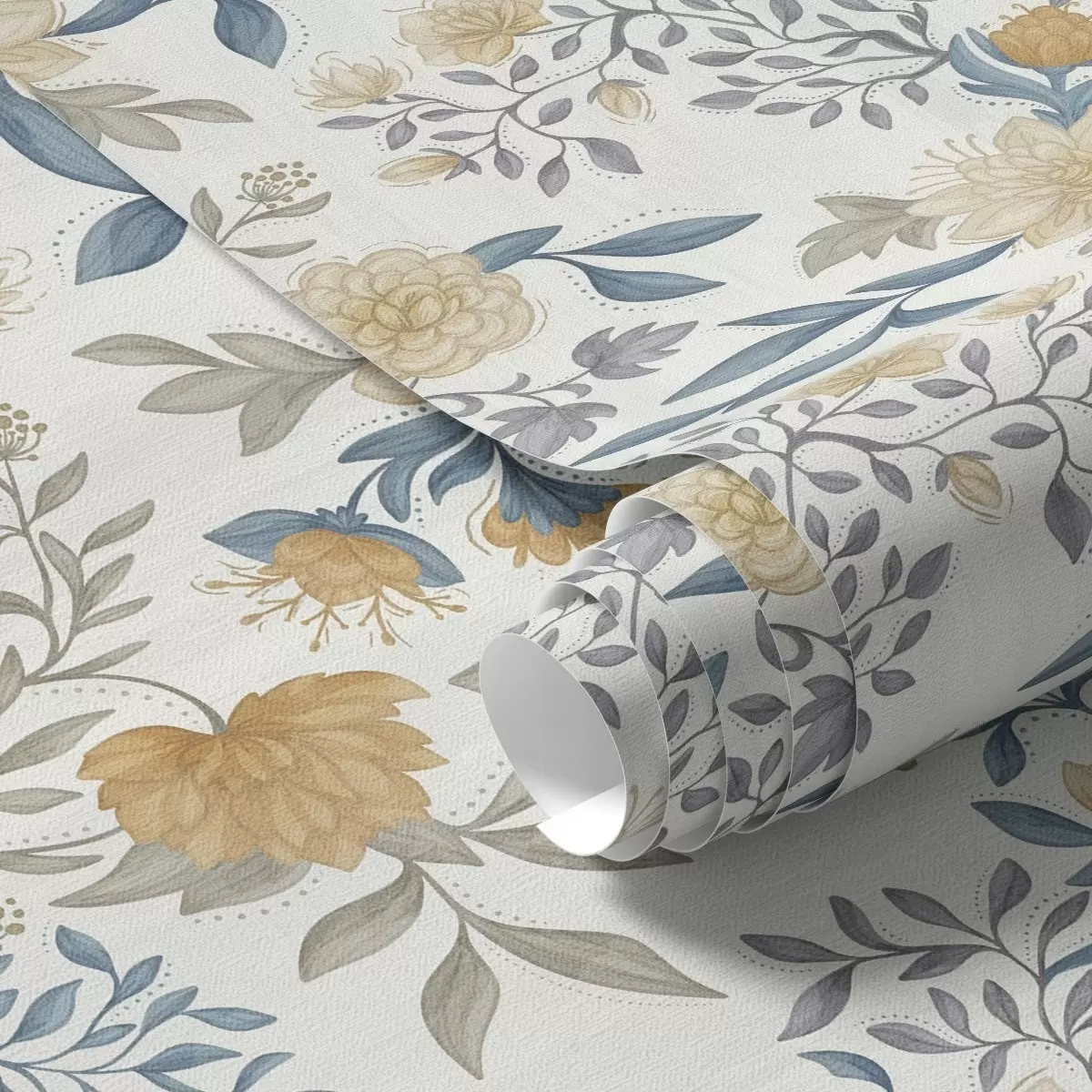 Tapetes Dzeltenas puķes un zils zaļums uz piena balta fona Nr. a00934v2