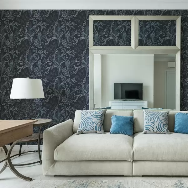 Tapetes Tumši indigo krāsas izliektas lapas ar roku zīmētu ēnojumu Nr. a00935