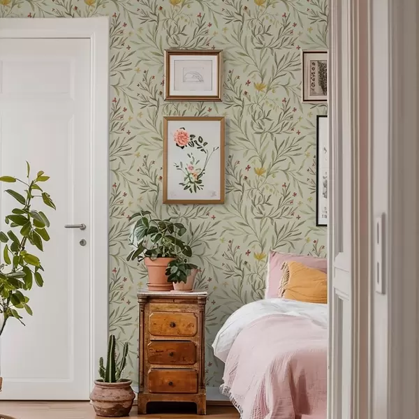 Tapetes Dzeltenas un sarkanas puķes uz gaiši zaļgana fona Nr. a00937