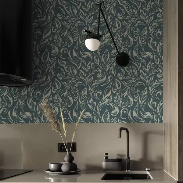 Tapetes Zaļš raksts no gaišām līnijām uz zils pelēka fona Nr. a00940