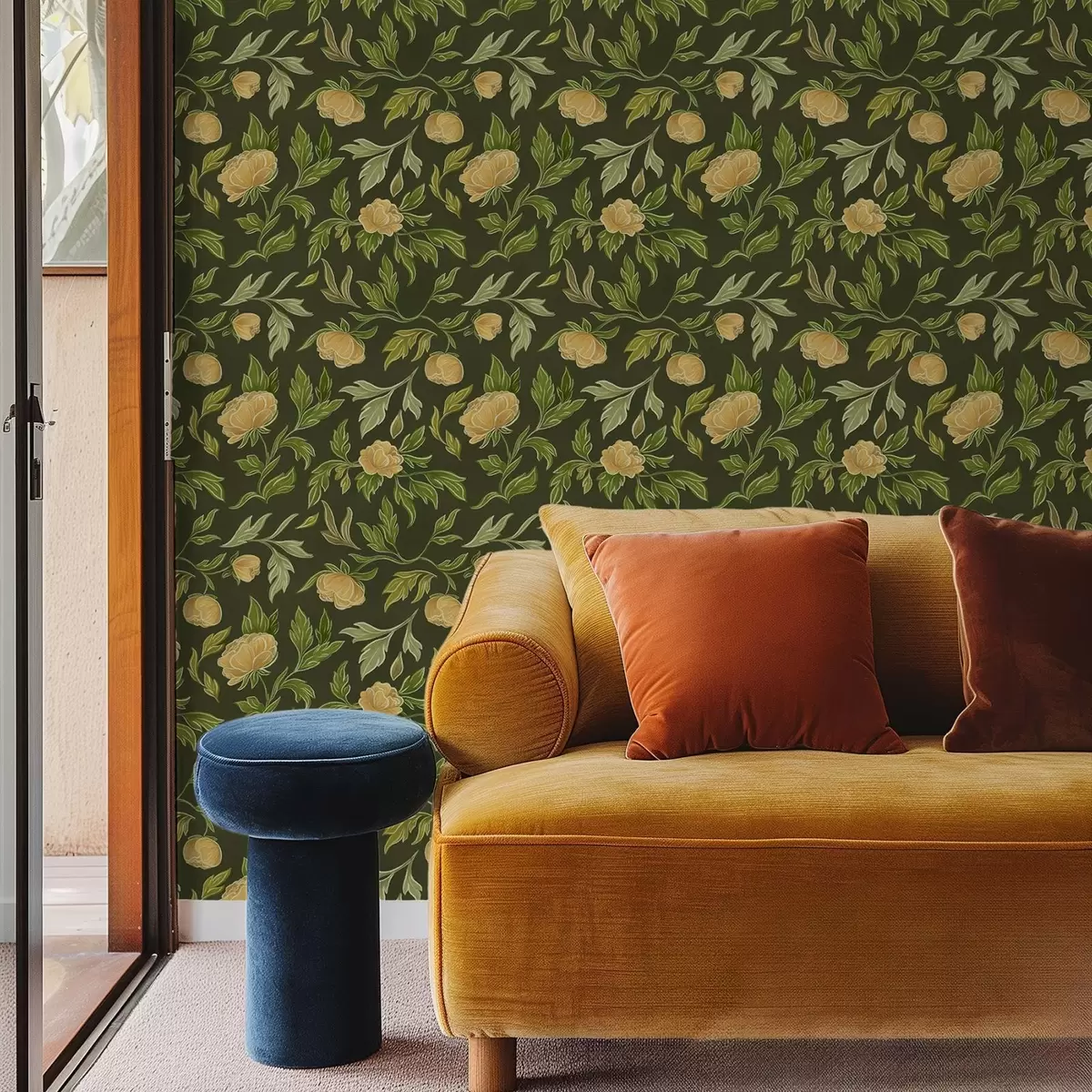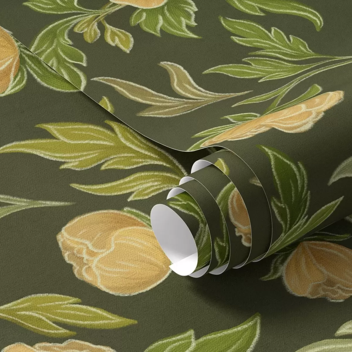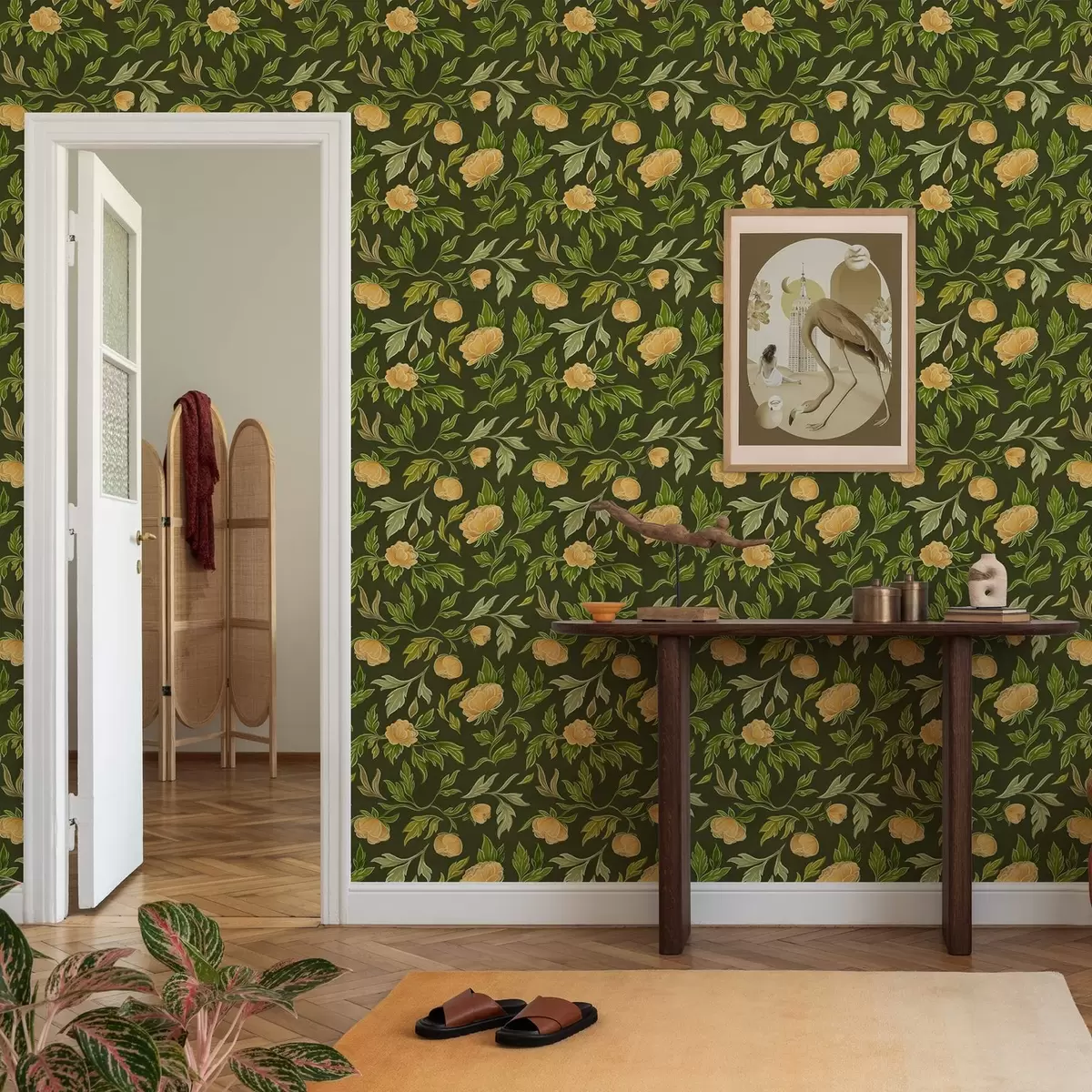 Tapetes Dzeltenas peonijas uz bagātīga tumši zaļa fona Nr. a00942v1