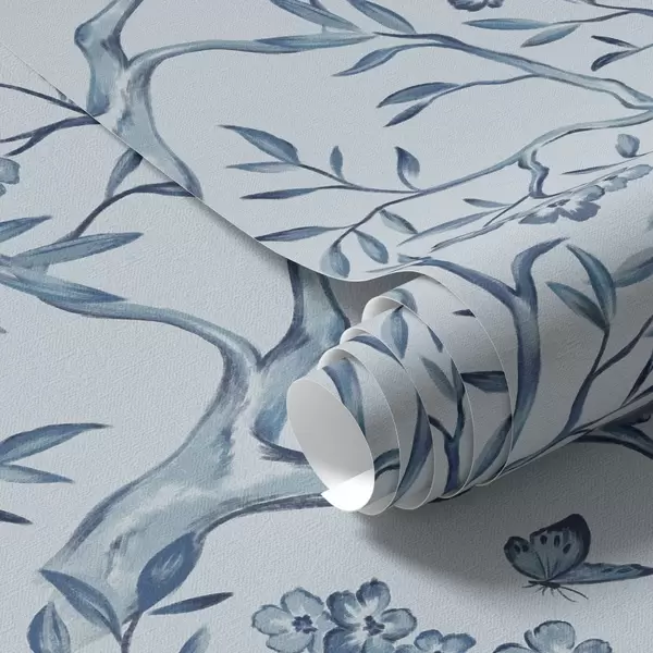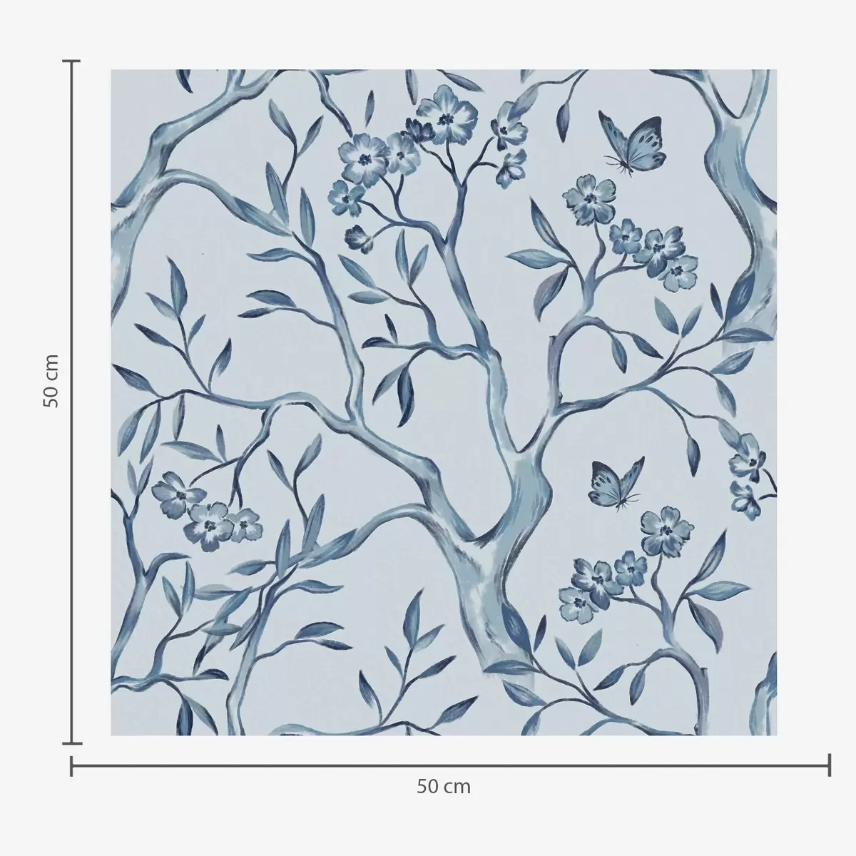 Tapetes Akvareļa zilas zaras ar ziediem un tauriņiem uz gaiša fona a00951