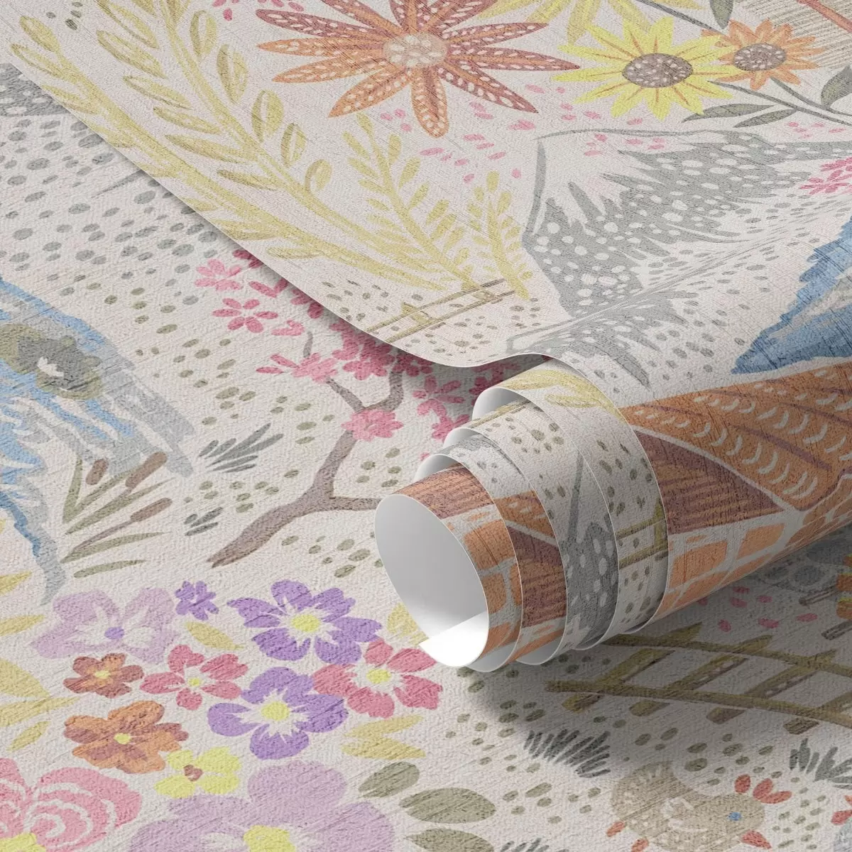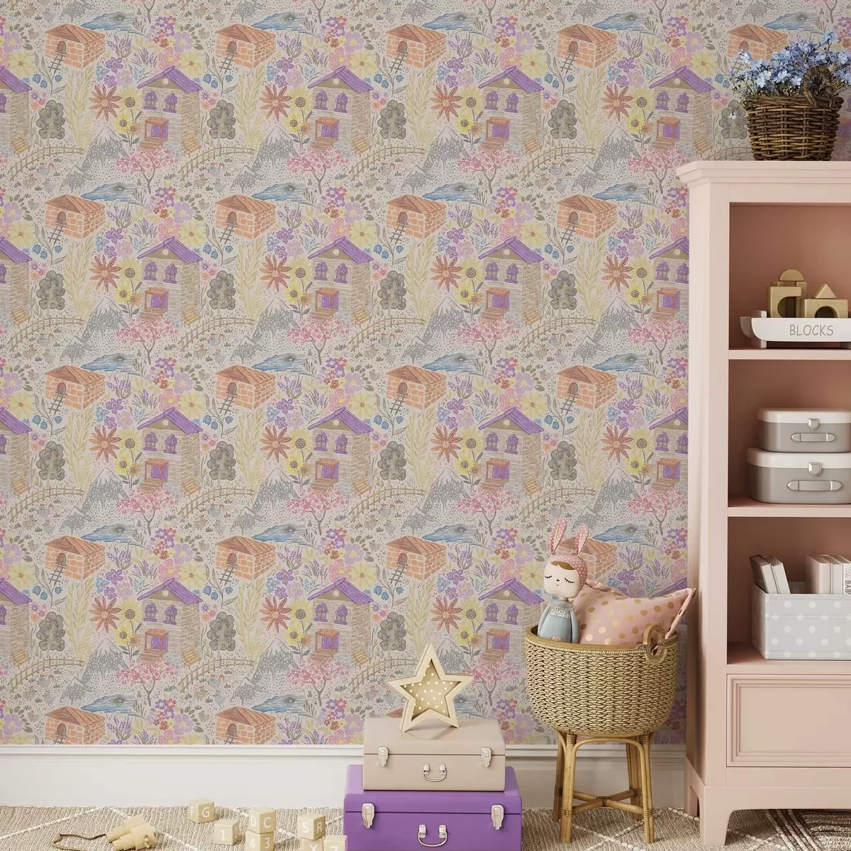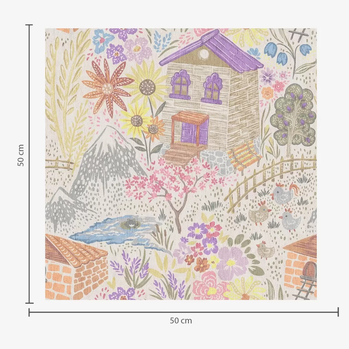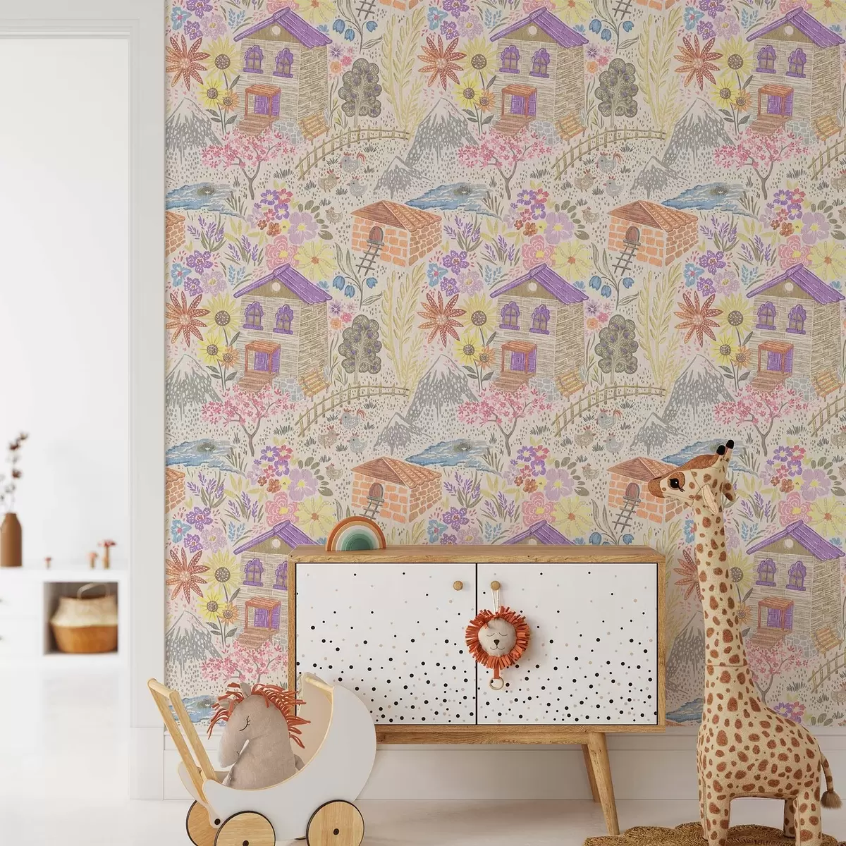 Tapetes Bērnišķīgs ciema zīmējums ar māju, kalniem un ziediem Nr. a00952