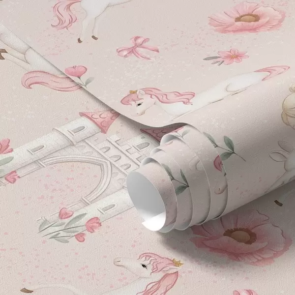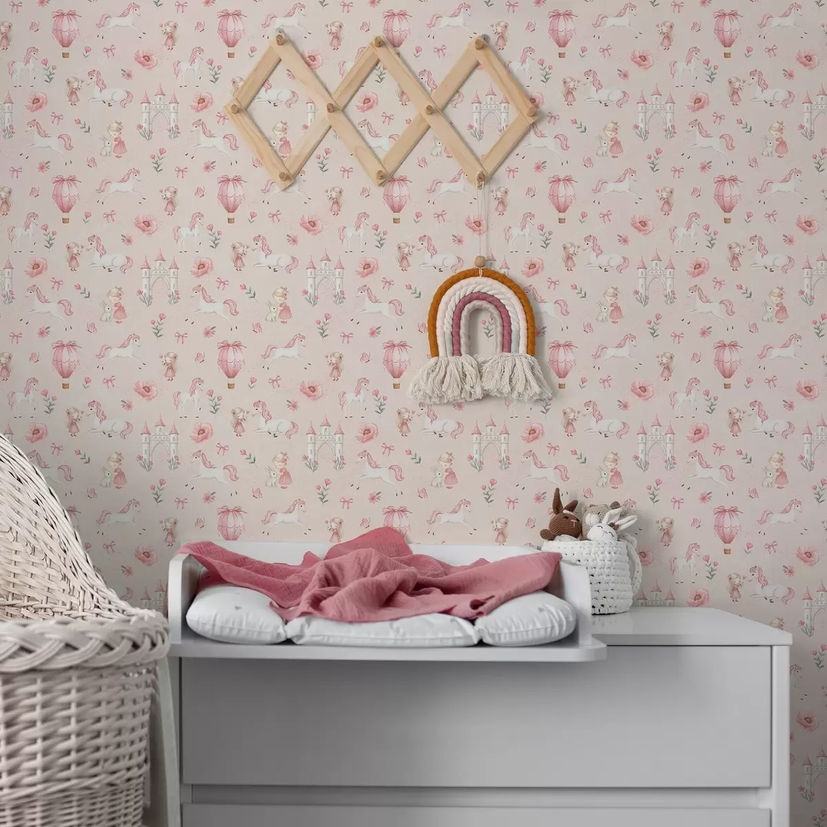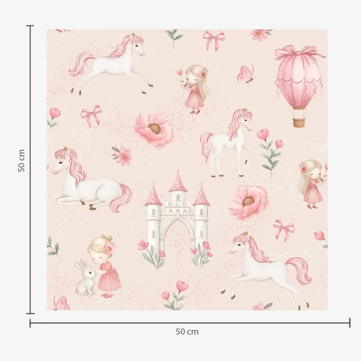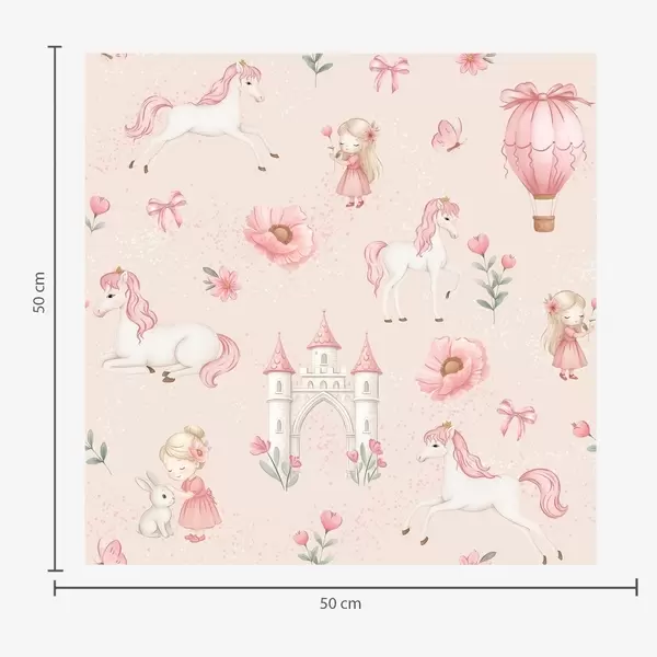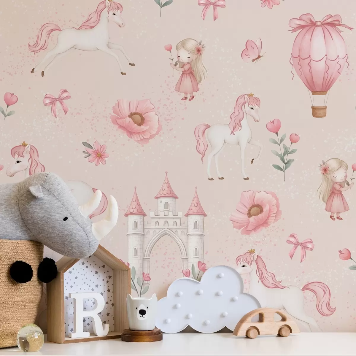 Tapetes Rozā vienradži, mazās meitenes un pils uz maiga fona Nr. a00957