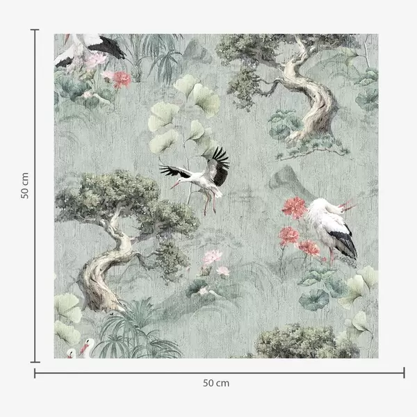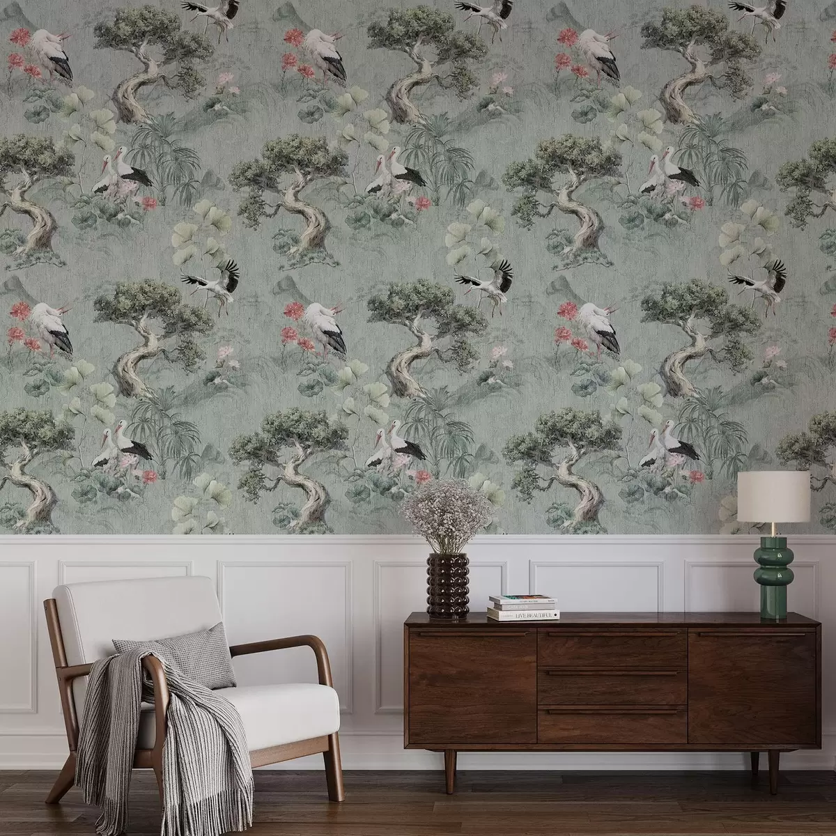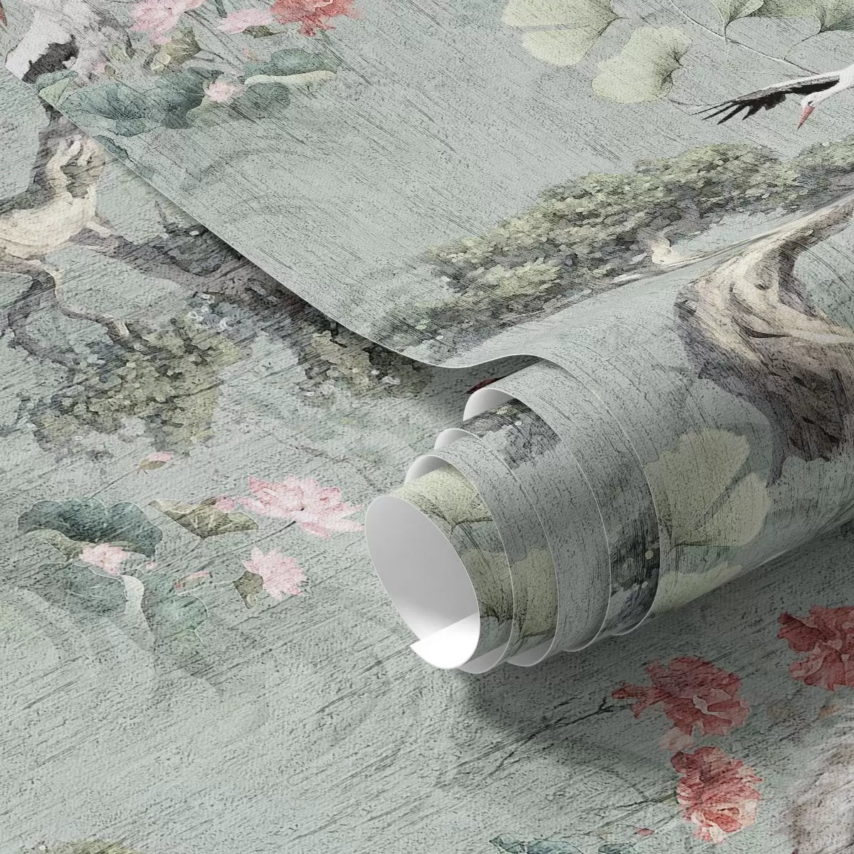Tapetes Celtņi starp priedēm un lotosiem uz mierīga zaļa fona Nr. a00962