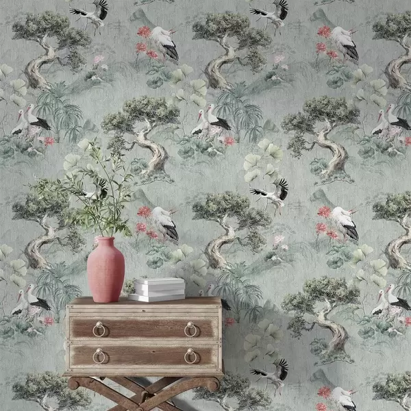 Tapetes Celtņi starp priedēm un lotosiem uz mierīga zaļa fona Nr. a00962