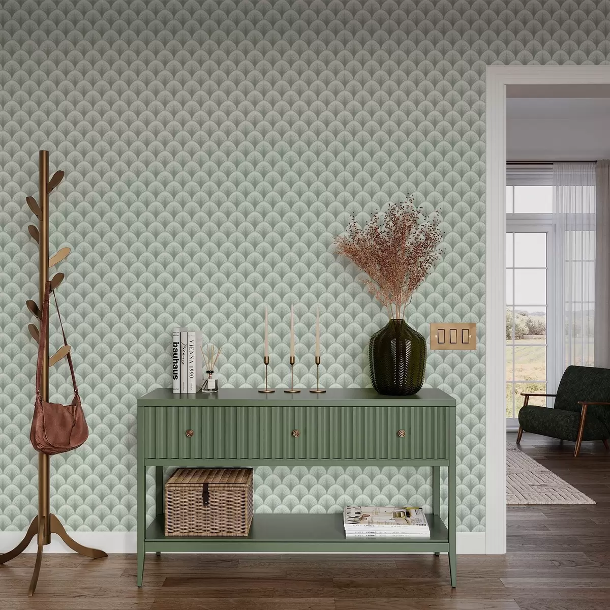 Tapetes Mint ventilatora arkas ar stariem uz maiga zaļgana fona Nr. a00978v2
