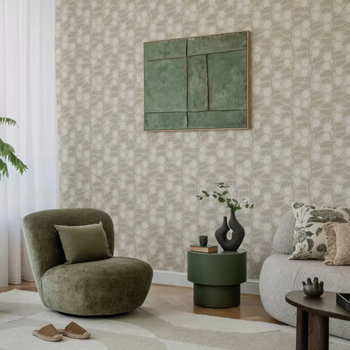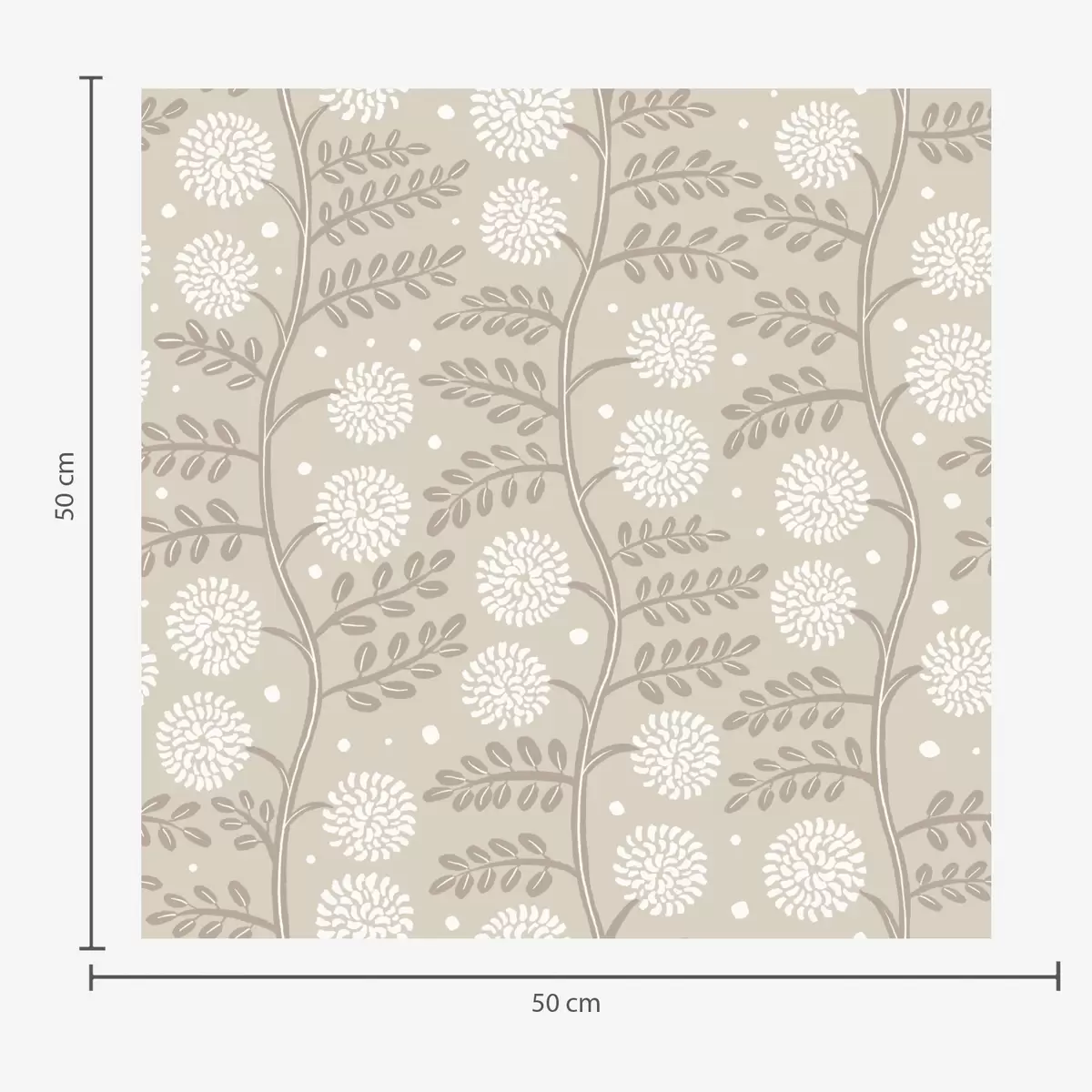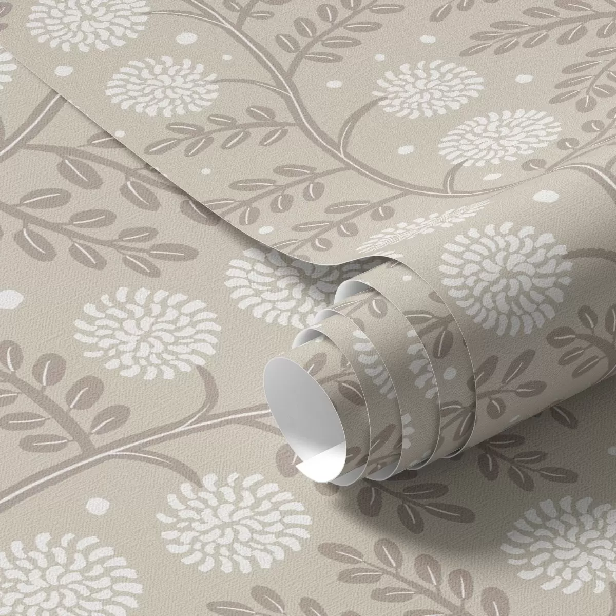 Tapetes Bēša krāsas stublāji ar baltiem pūkainiem ziediem un maigiem punktiņiem Nr. a00997