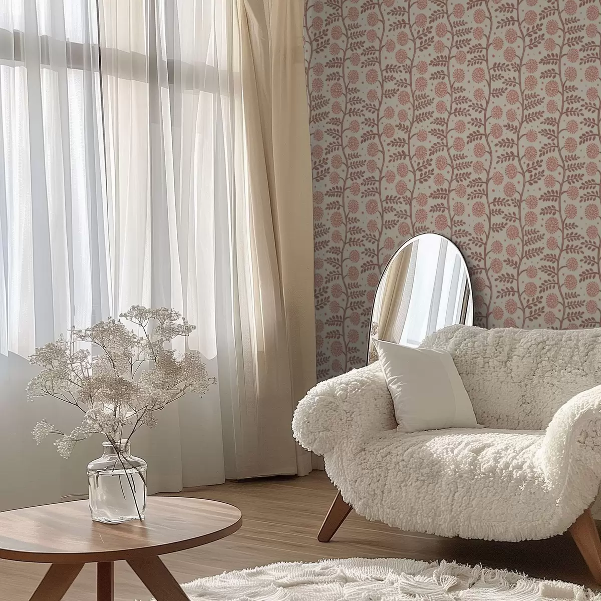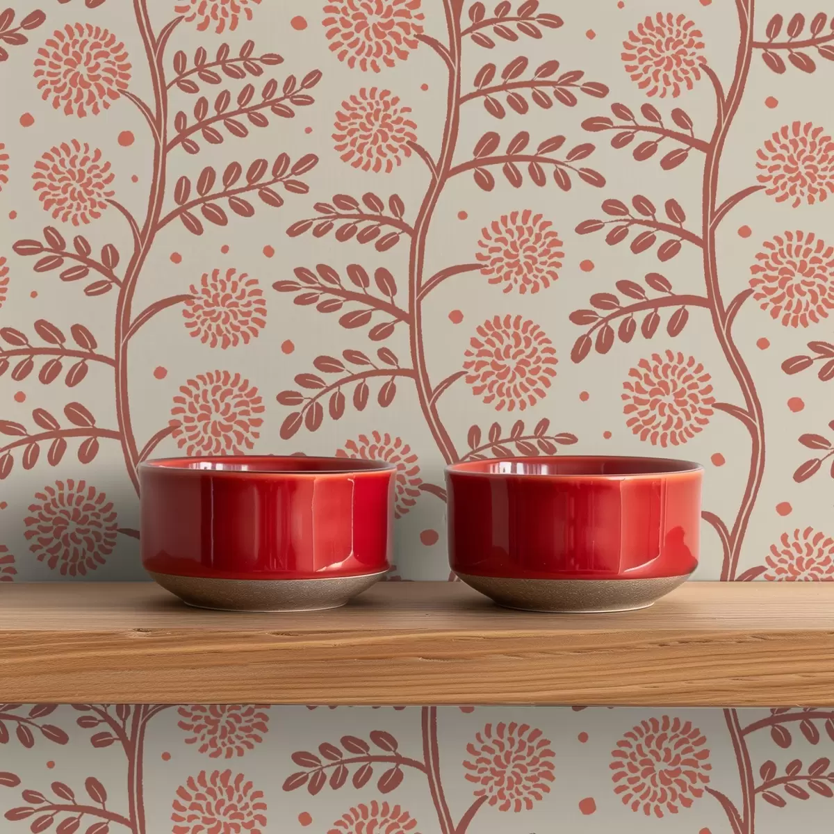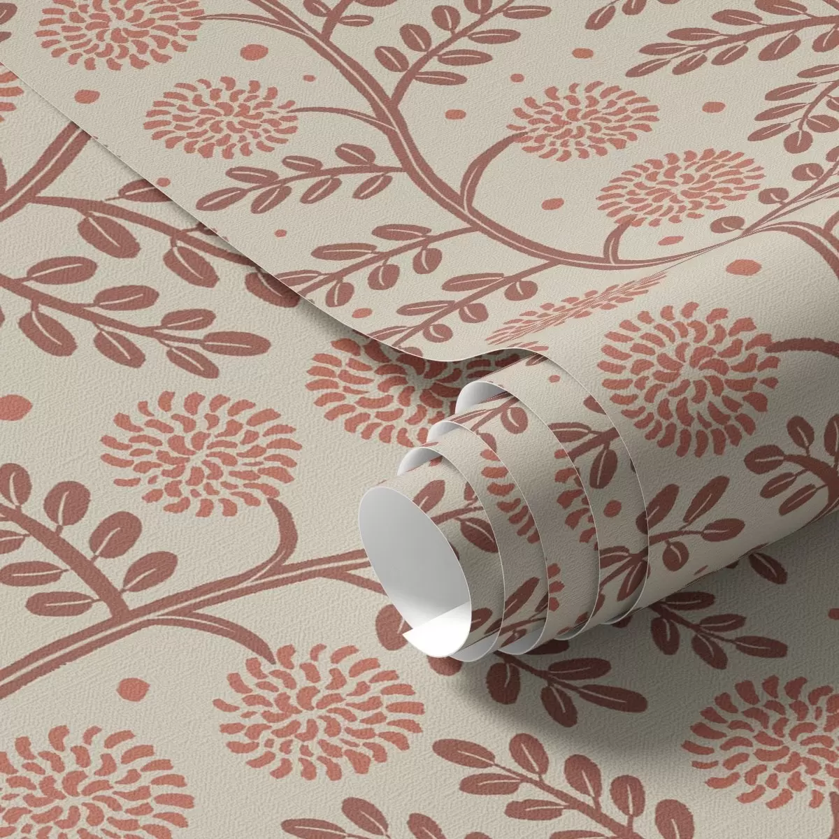 Tapetes Terakotas kātiņi ar korallkrāsas pūkainiem ziediem uz krēmkrāsas fona Nr. a00997v1