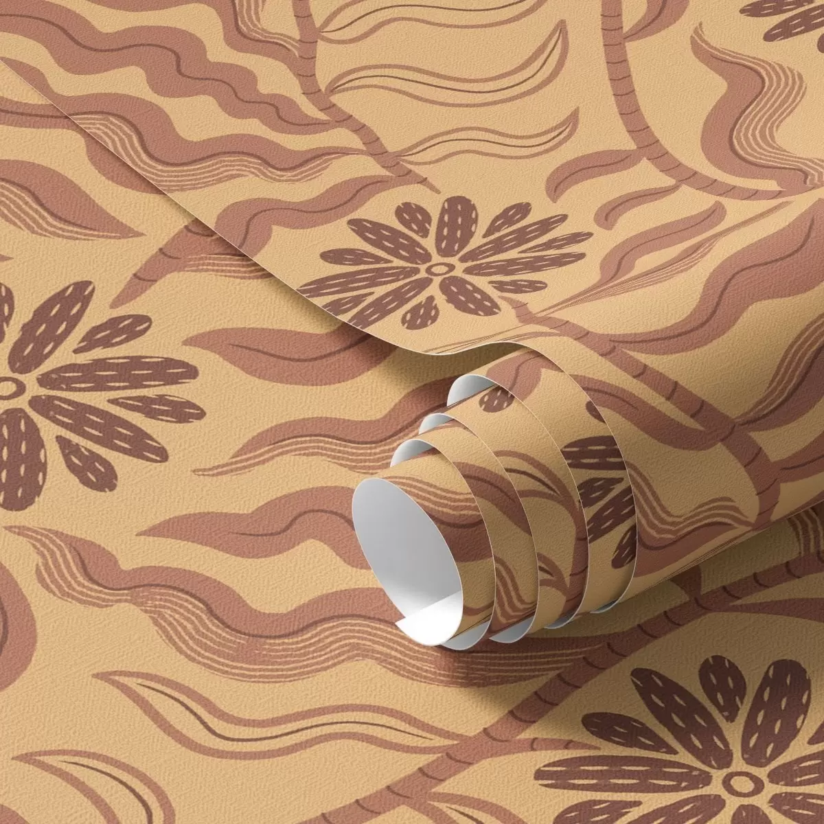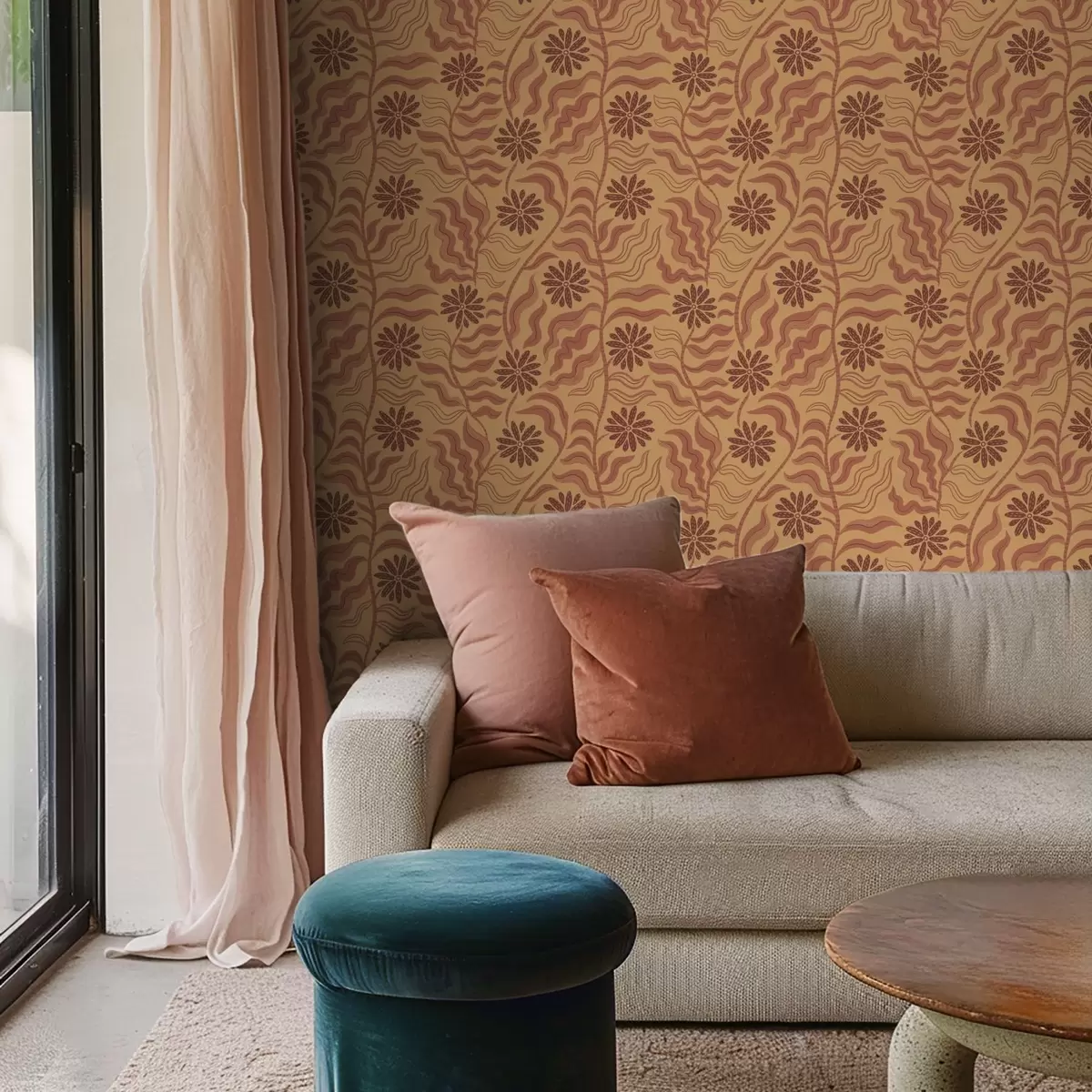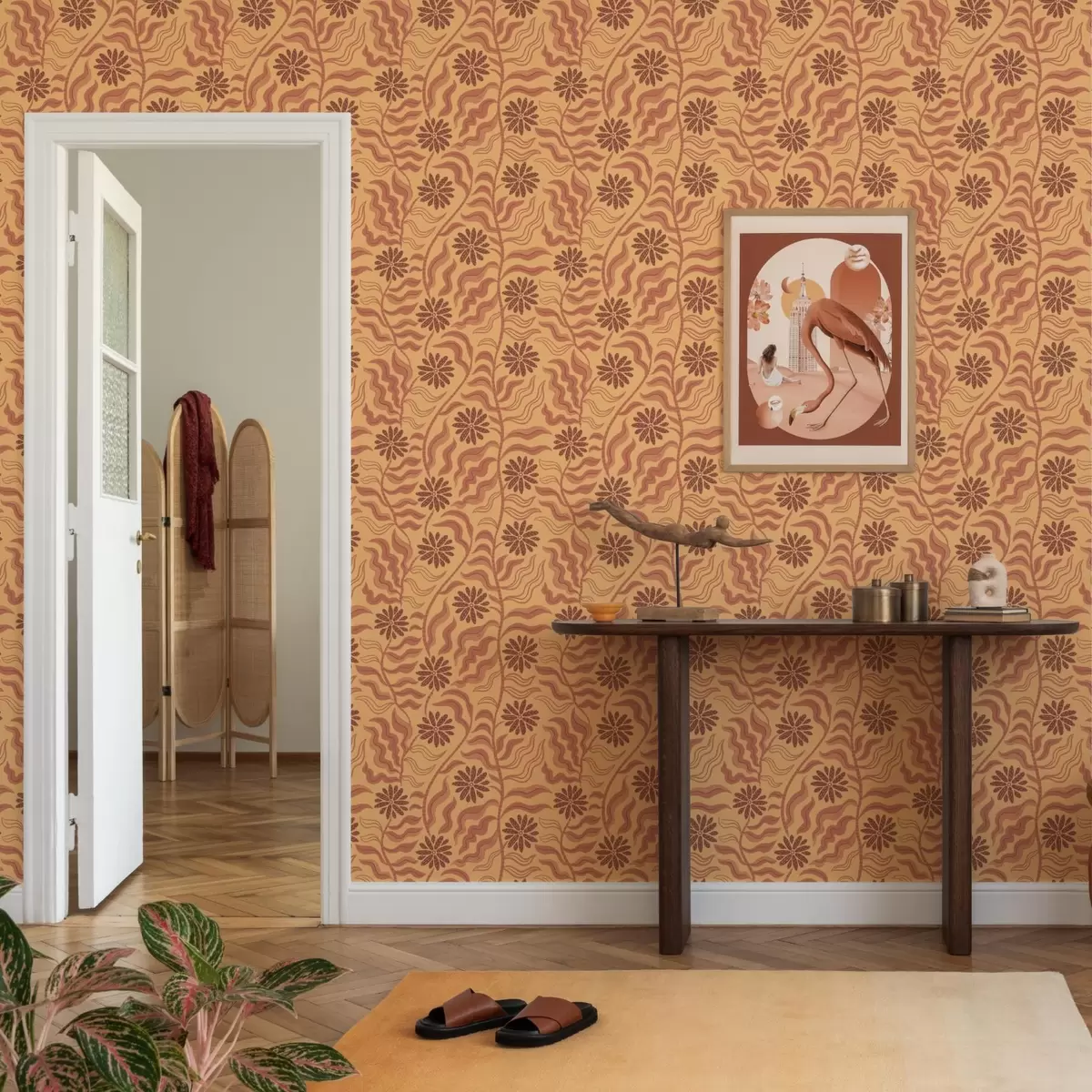 Tapetes Siltas, viļņotas ziedi un lapas sinepju-terakotas toņos Nr. a00998v2