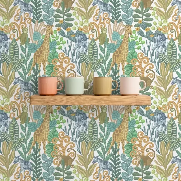 Tapetes Priecīgi savannas dzīvnieki starp lapām uz balta fona Nr. a01000