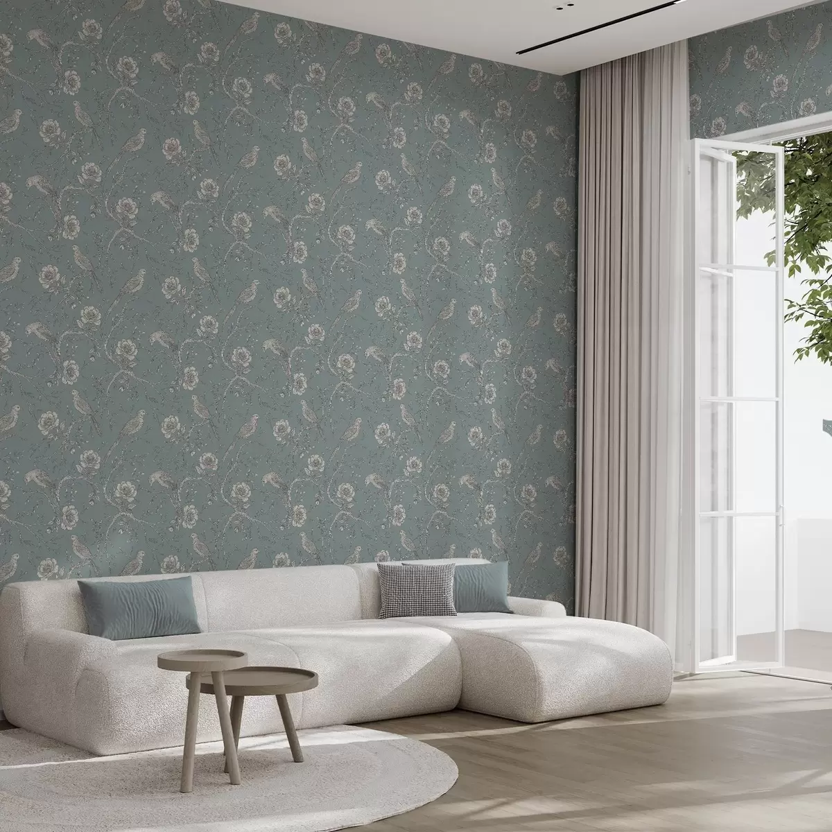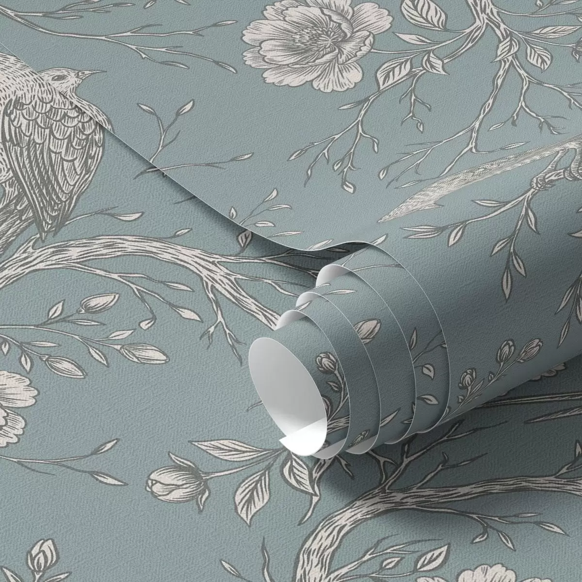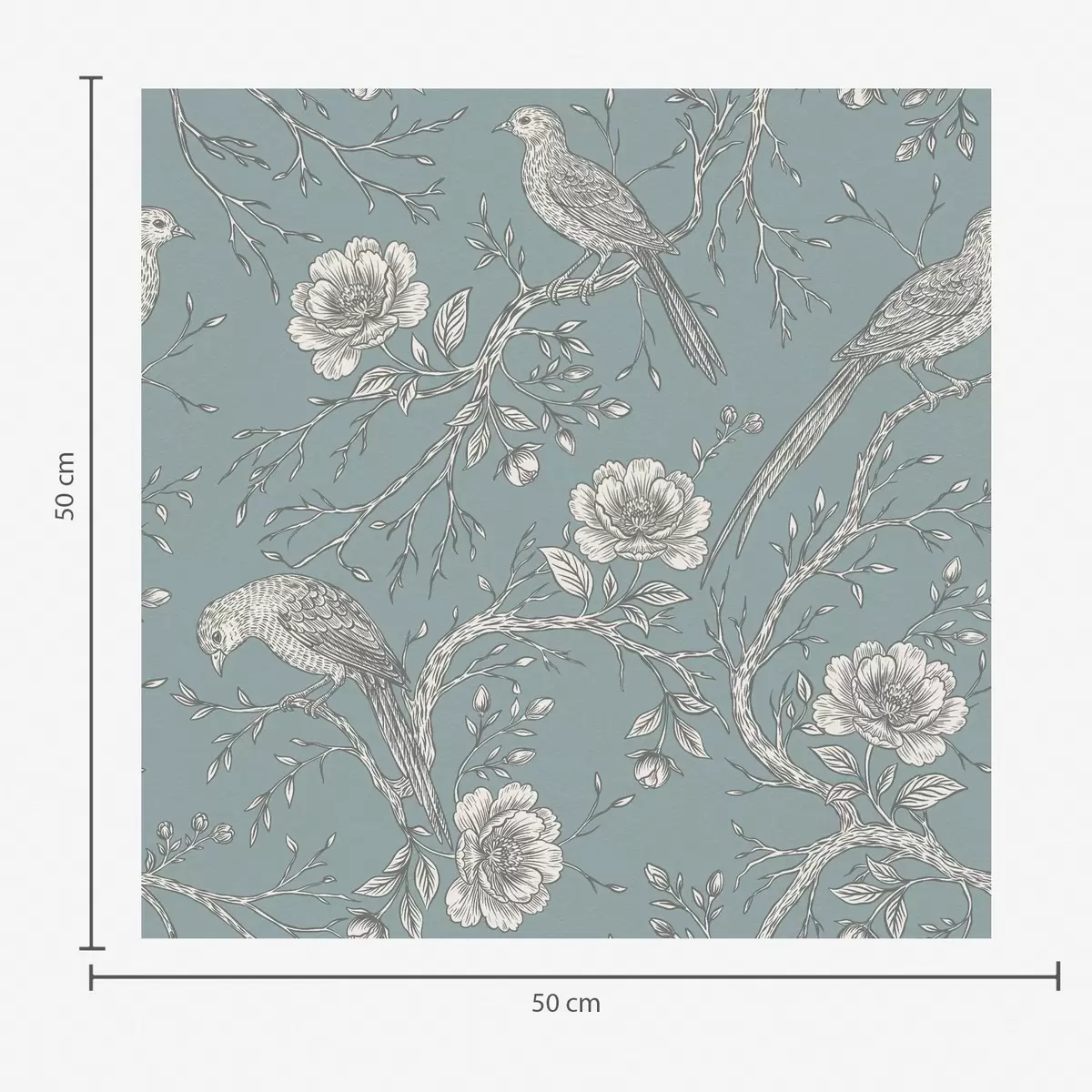 Tapetes Kontūru zīmēti putni uz zariem, kluss zils fons Nr. a01022