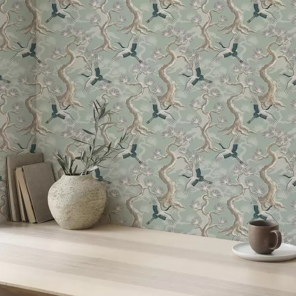 Tapetes Celtņi starp izliektām zarām uz maiga salvijas krāsas fona Nr. a01023