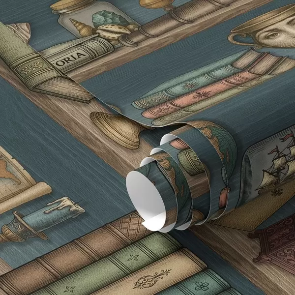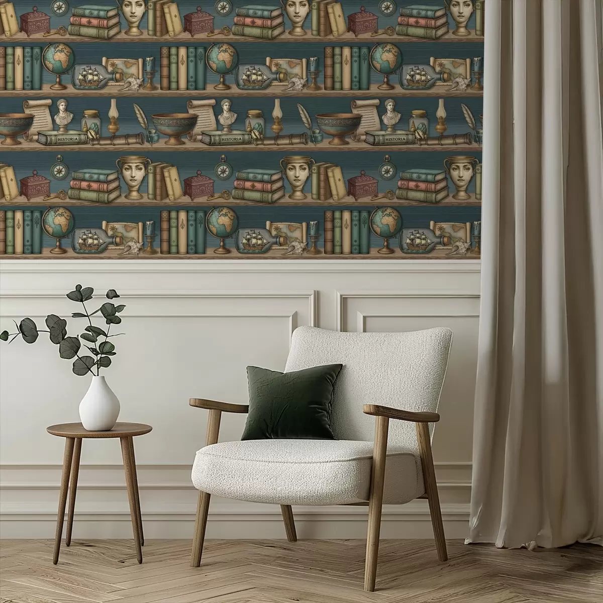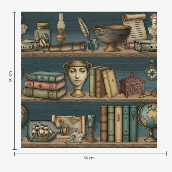 Tapetes Vintage plaukti ar grāmatām, globusu un jūras retumiem Nr. a01036