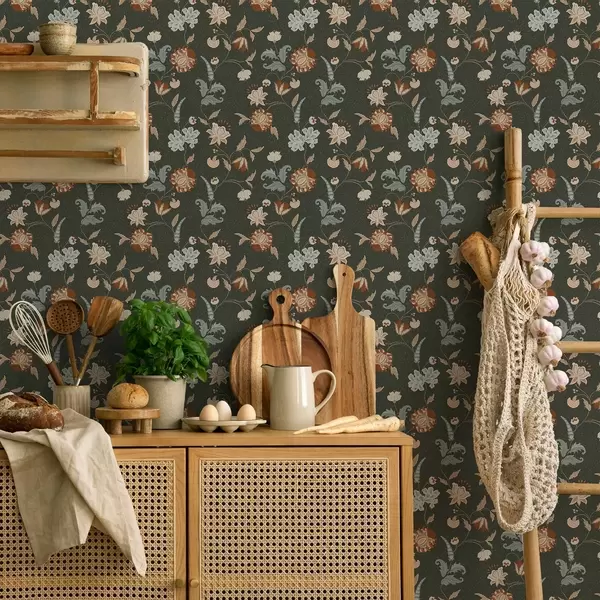 Tapetes Tumši zaļš fons ar dekoratīviem ziediem un lapām Nr. a01086