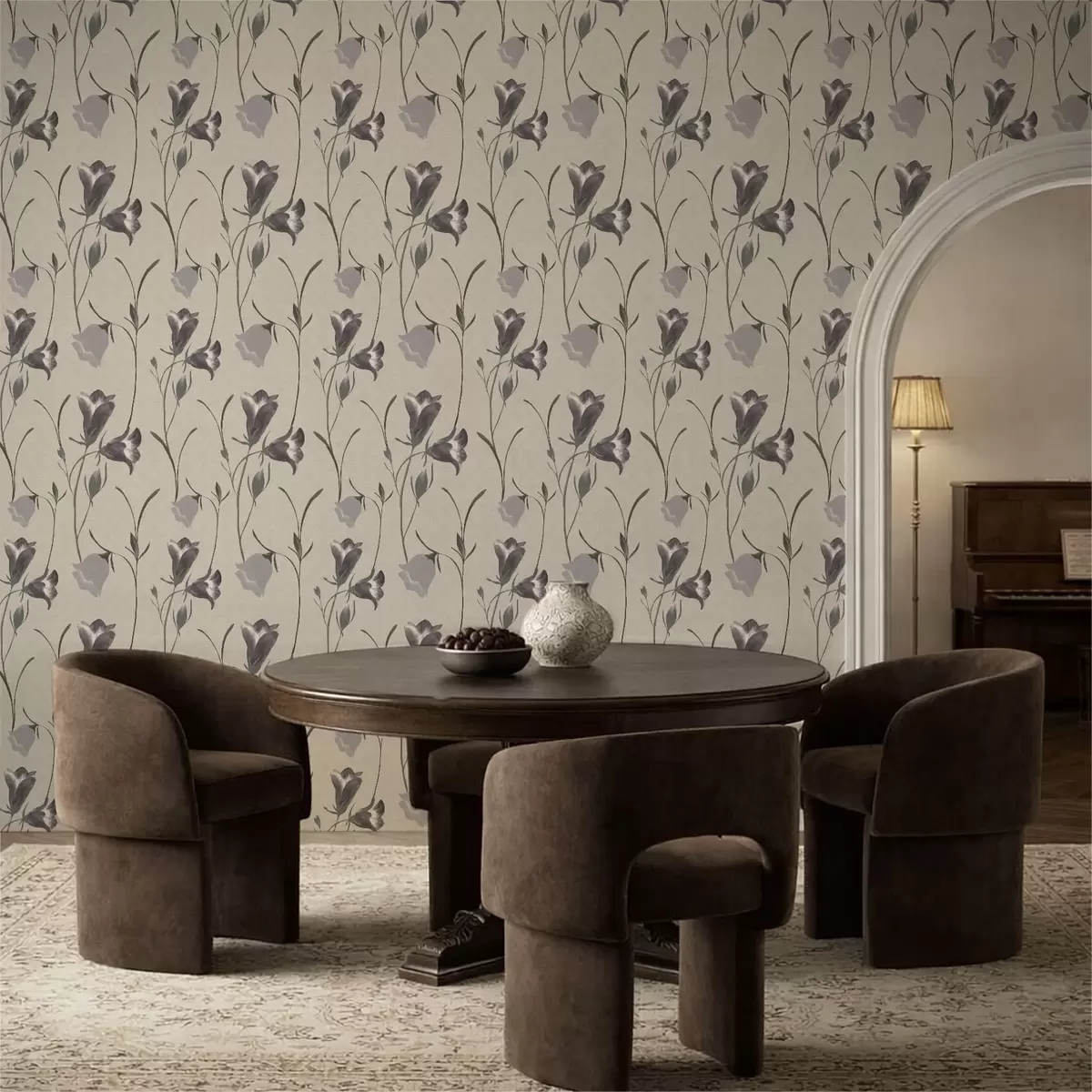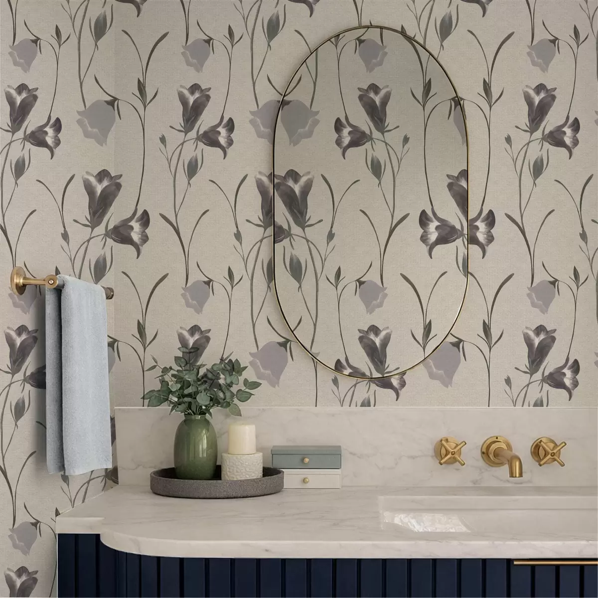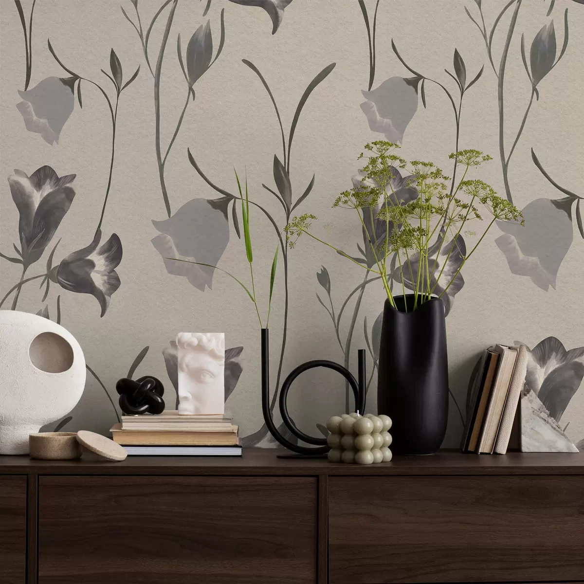 Tapetes Pelēki zvaniņveida ziedi uz gaiši smilškrāsas fona Nr. a01119