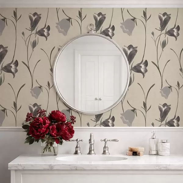 Tapetes Pelēki zvaniņveida ziedi uz gaiši smilškrāsas fona Nr. a01119