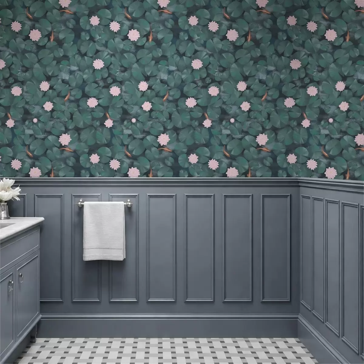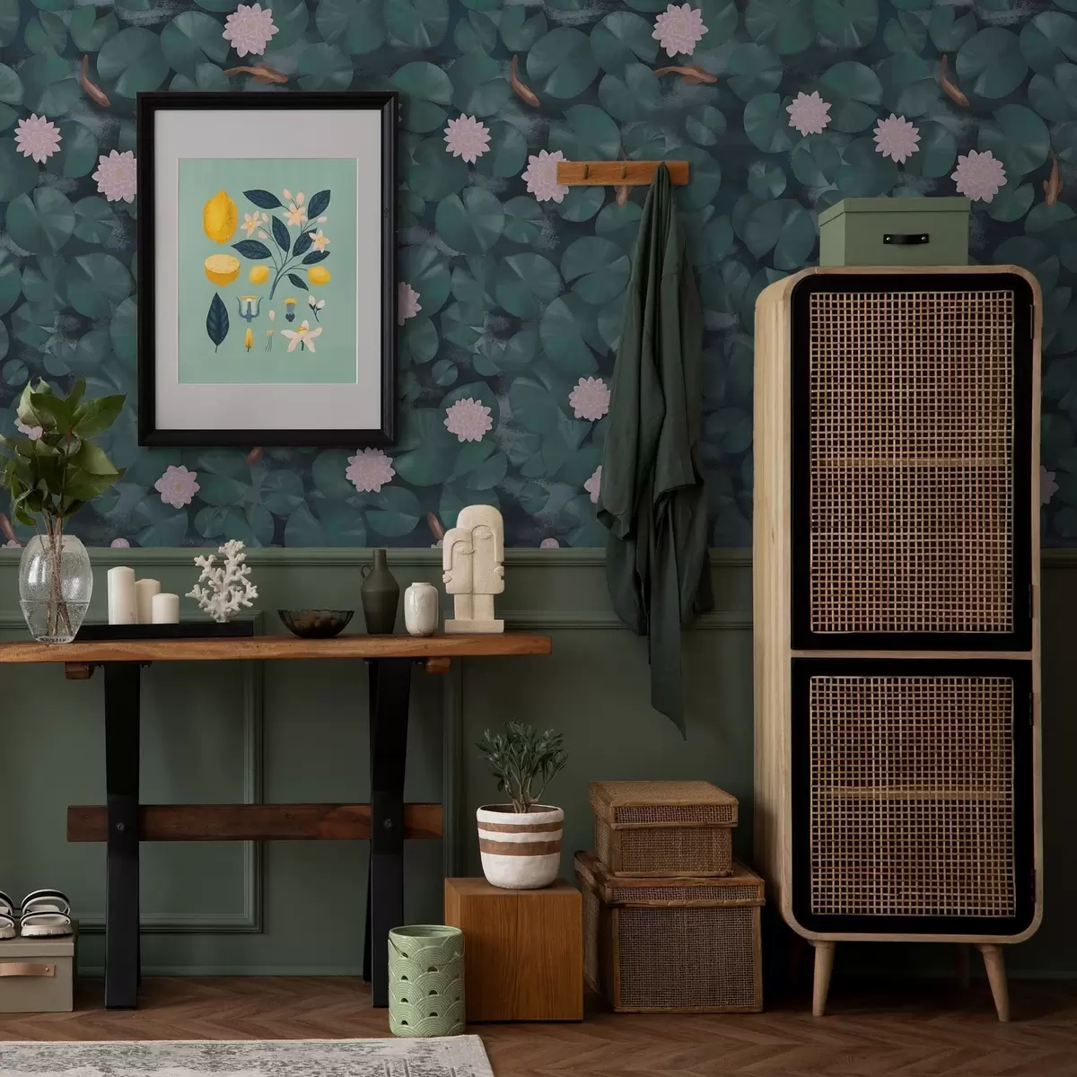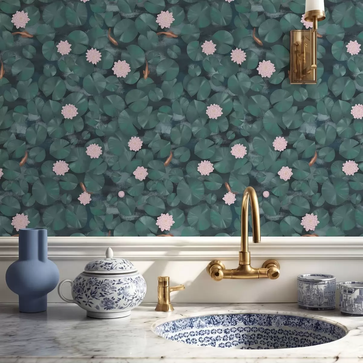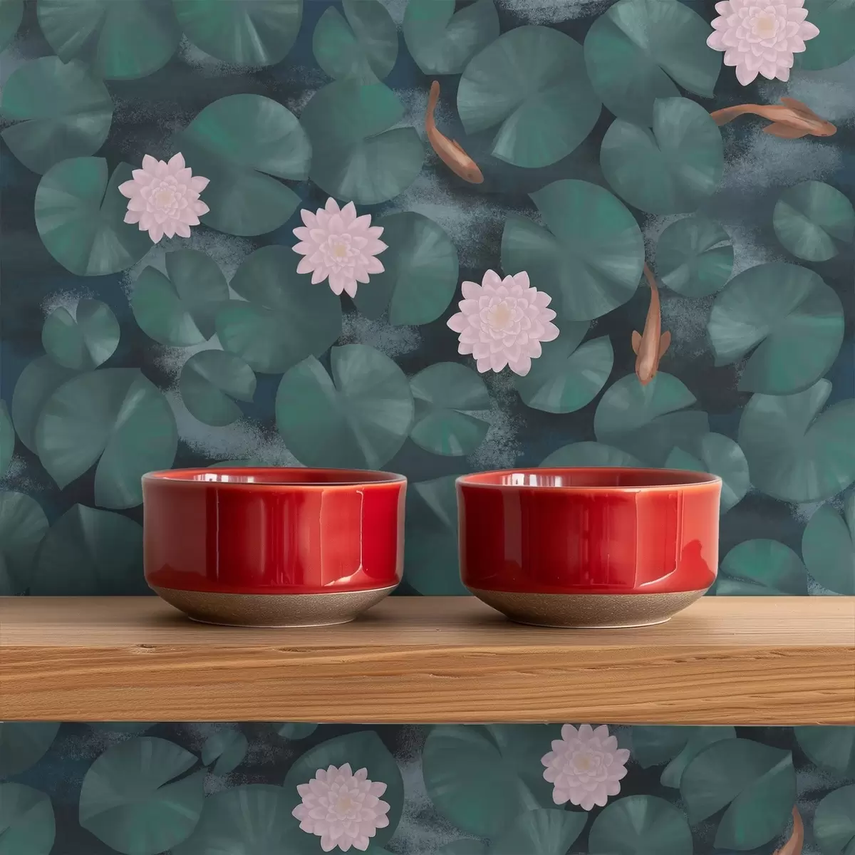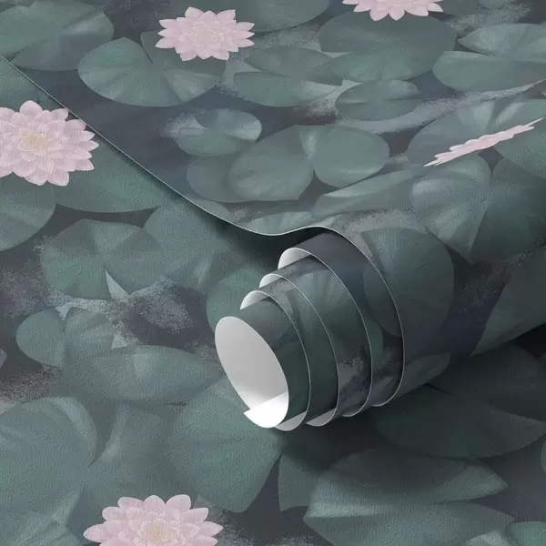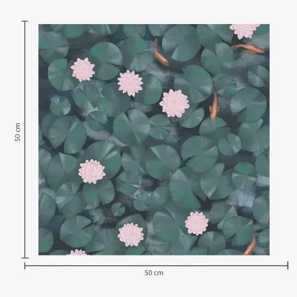 Tapetes Ūdensrozes ar ziediem un zivīm uz tumša fona Nr. a01177